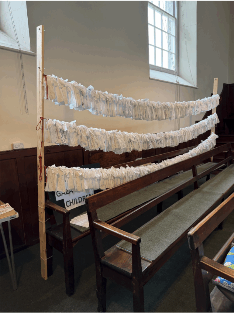 The Truro Friends have obtained from reliable sources the names and ages of the 11,700 Palestinian children killed in Gaza up to January 2024. The names and ages have been written on strips of white cloth. They have about 40 lines of these pieces of cloth of which 6 are hanging in the Meeting House.